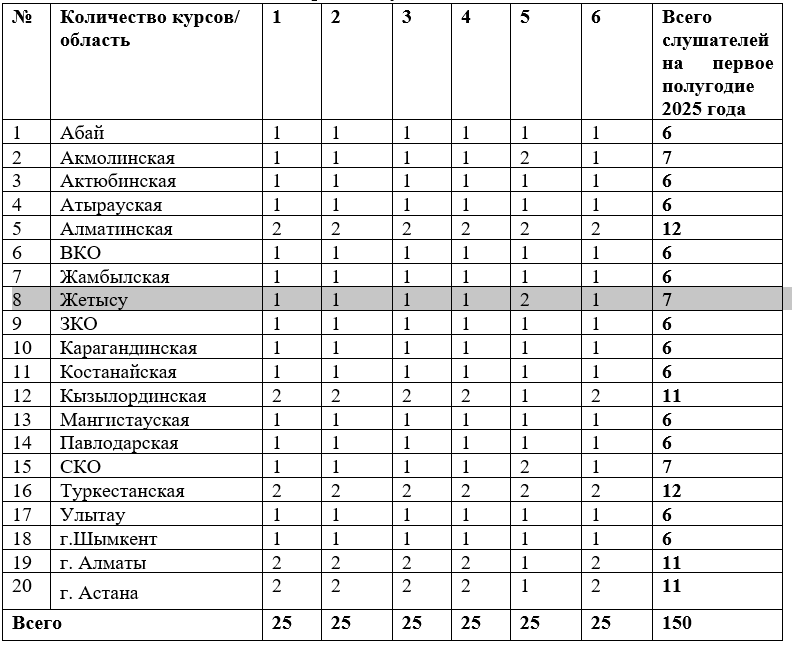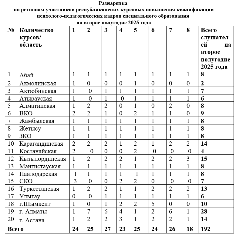 Разнарядка по регионам участников республиканских курсовых повышения квалификации психолого-педагогических кадров специального образования на первое полугодие 2025 года